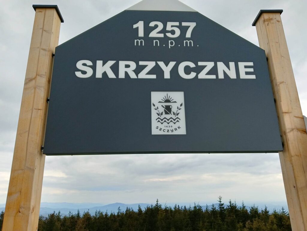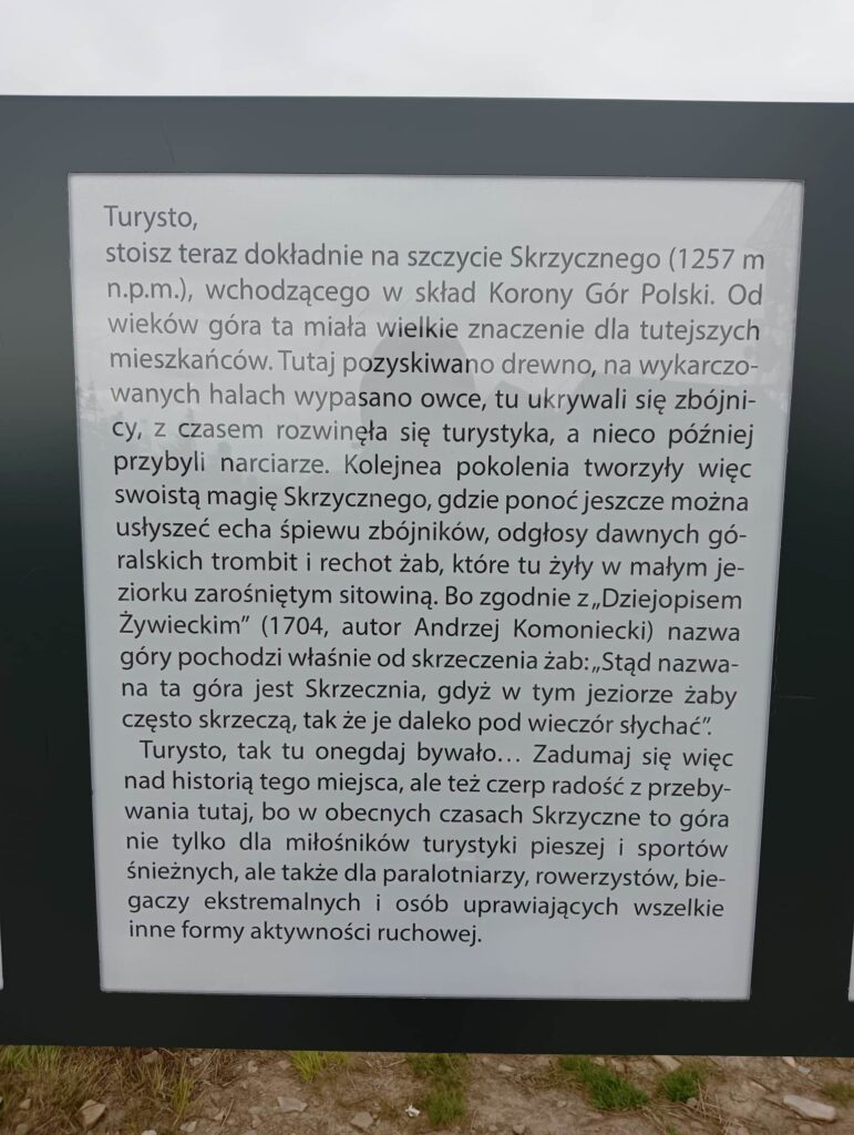 Na szczycie Skrzycznego znajdziemy kilka informacji o pochodzeniu nazwy góry oraz informację, jak wysoko jesteśmy nad poziomem morza.