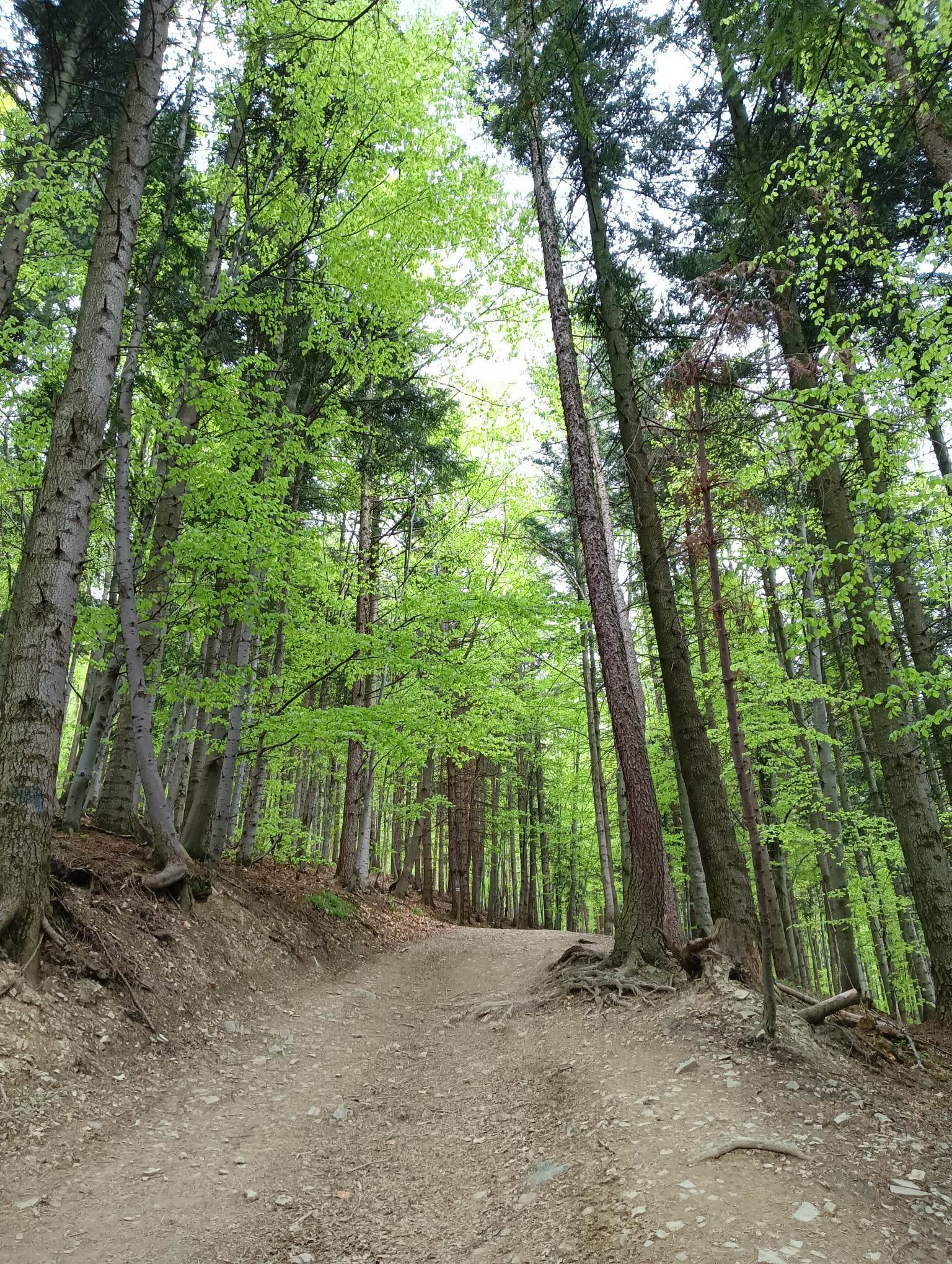 Im dalej w las, tym ciekawszy jest szlak. Początkowo idziemy drogą, ale już leśną. Im wyżej, tym ciekawiej i ścieżka zaczyna wyglądać jak górski szlak.