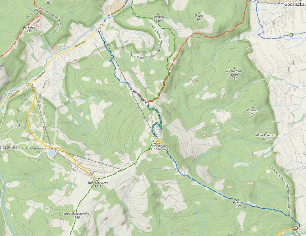 - szlak żółty – na Małym Skrzycznem łączy się z zielonym (5,2 km, 2:30 h do góry, 1:30 w dół)
